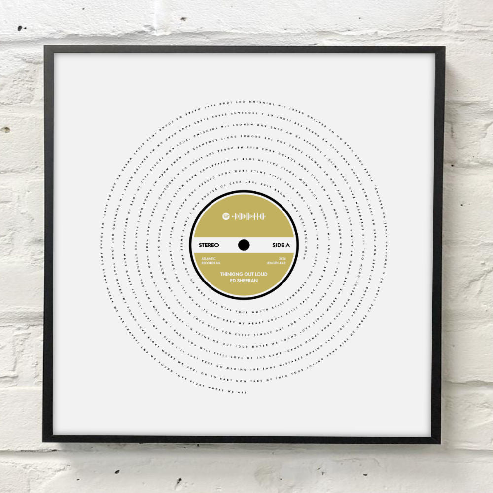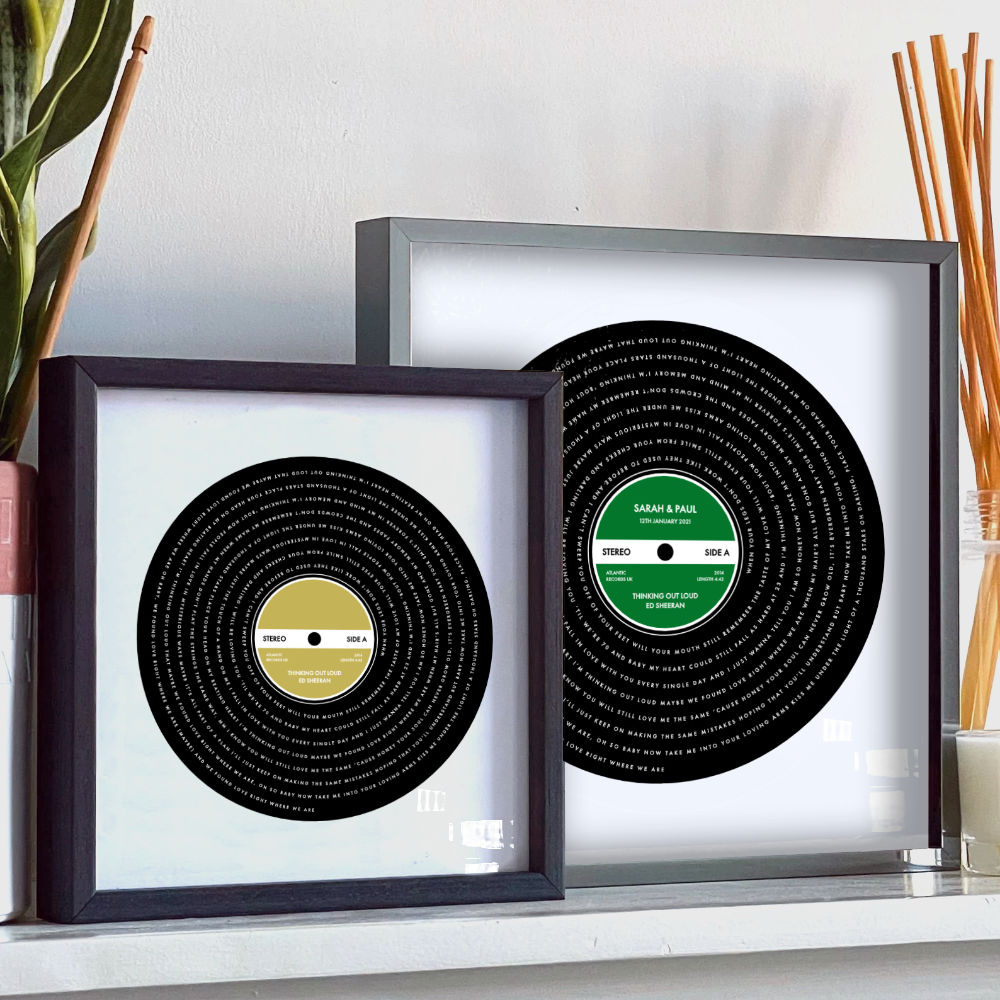 Display your favourite song lyrics in the shape of a vinyl record with our stylish song lyrics print. Can be personalised with names, dates or even custom text for a special occasion. For example, can be used as a Father's Day of your dad's favourite song, as an Anniversary gift displaying the First Dance song, a boyfriend/girlfriend gift displaying a special song you share, etc. Personalise it however you wish using our unique live preview designer.