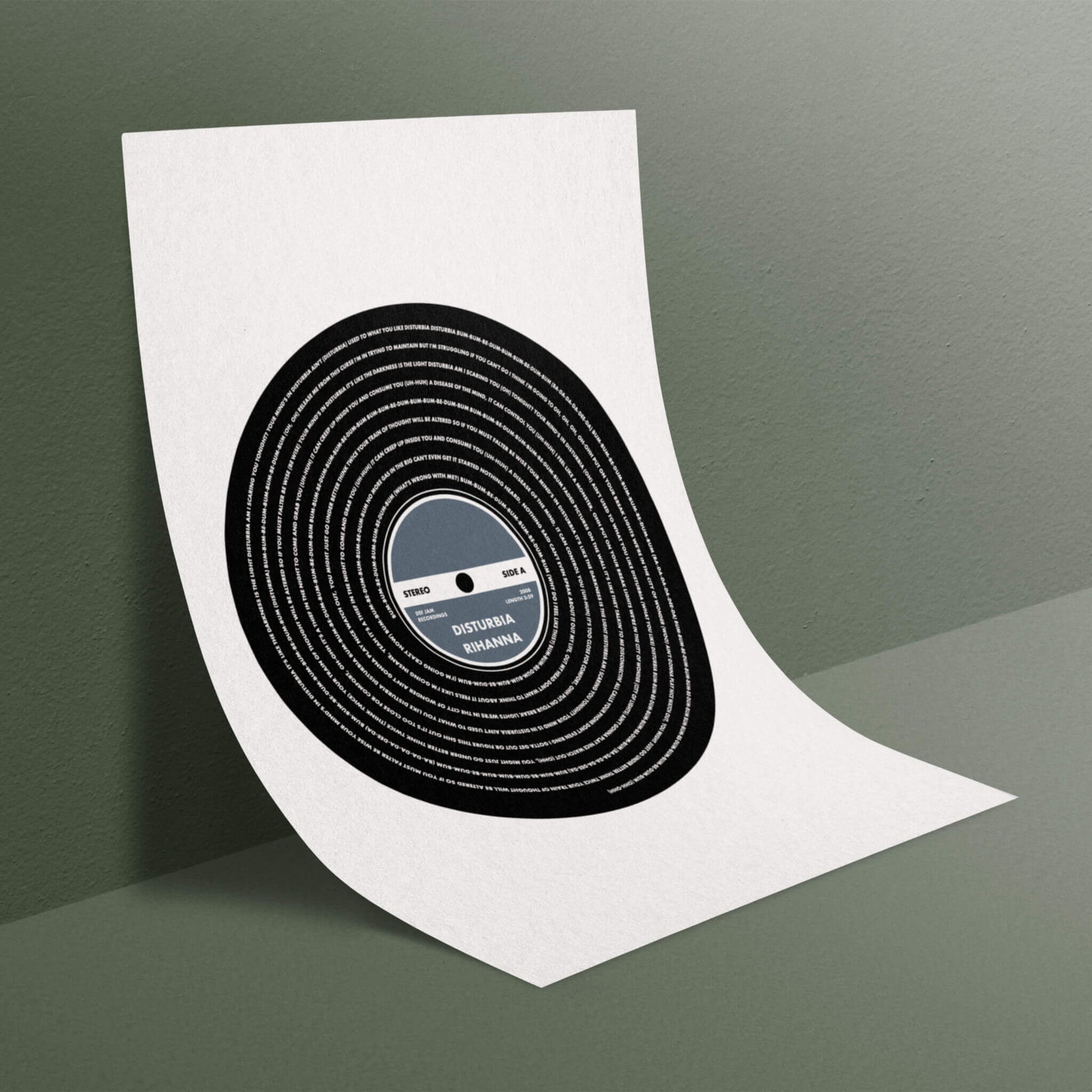 We create vinyl artwork displaying the song information at the centre and the song lyrics spiralling around the outside to form a beautiful piece of artwork.