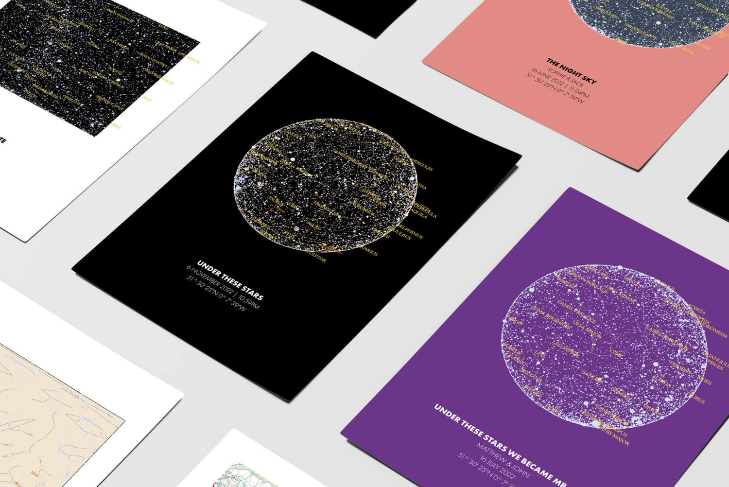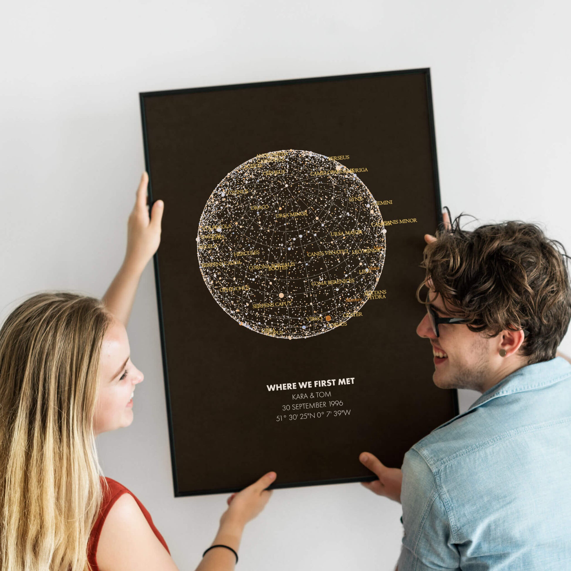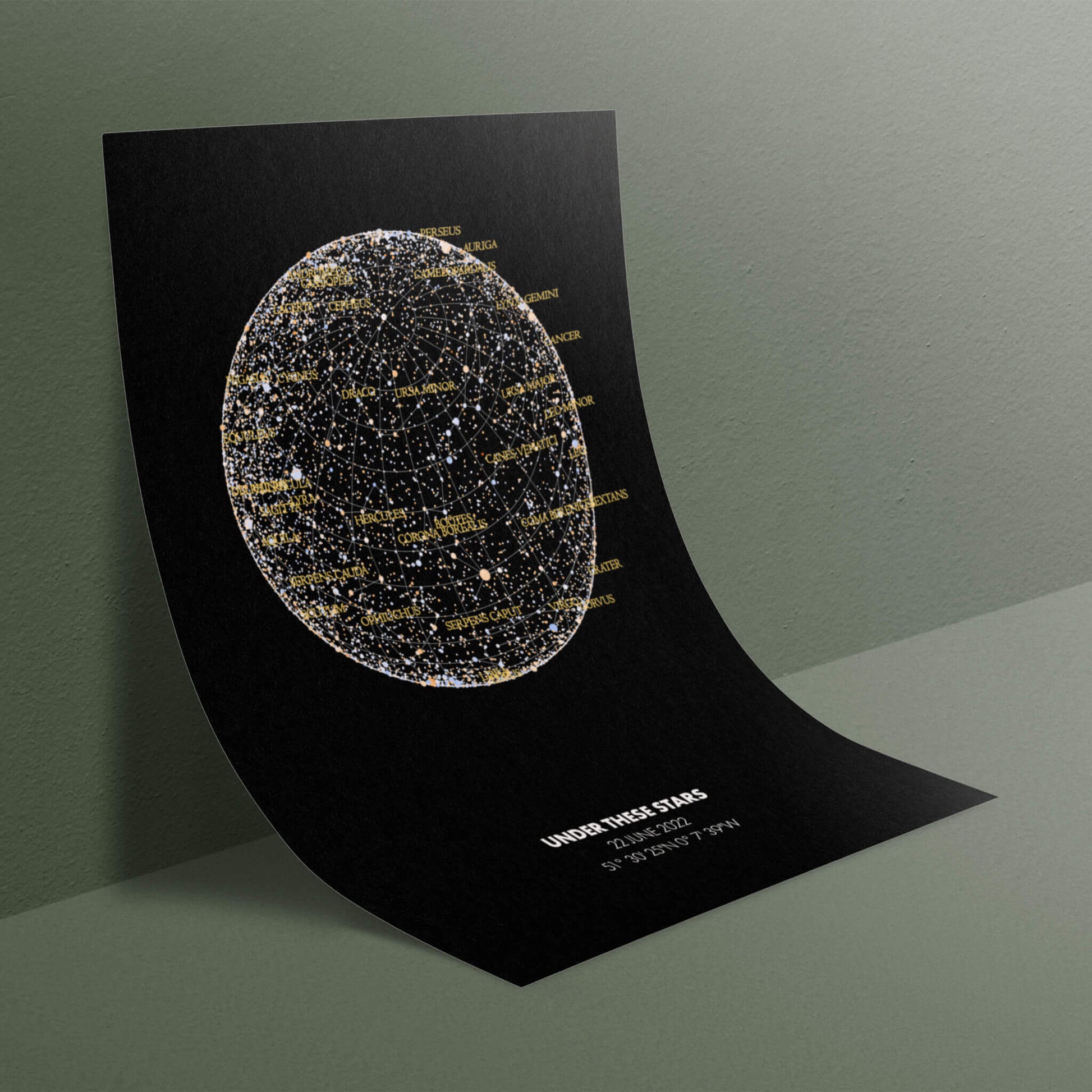 Our map of the stars poster displays how the stars appeared on any date (and time) and at any location in the world. Our star maps uniquely show between 6,000 and 8,000 stars, the planets, the Moon and the Sun depending on your chosen date/location. Each map beautifully shows the outline of the constellations and the name of the planets in high definition - we are the only company providing this level of detail.